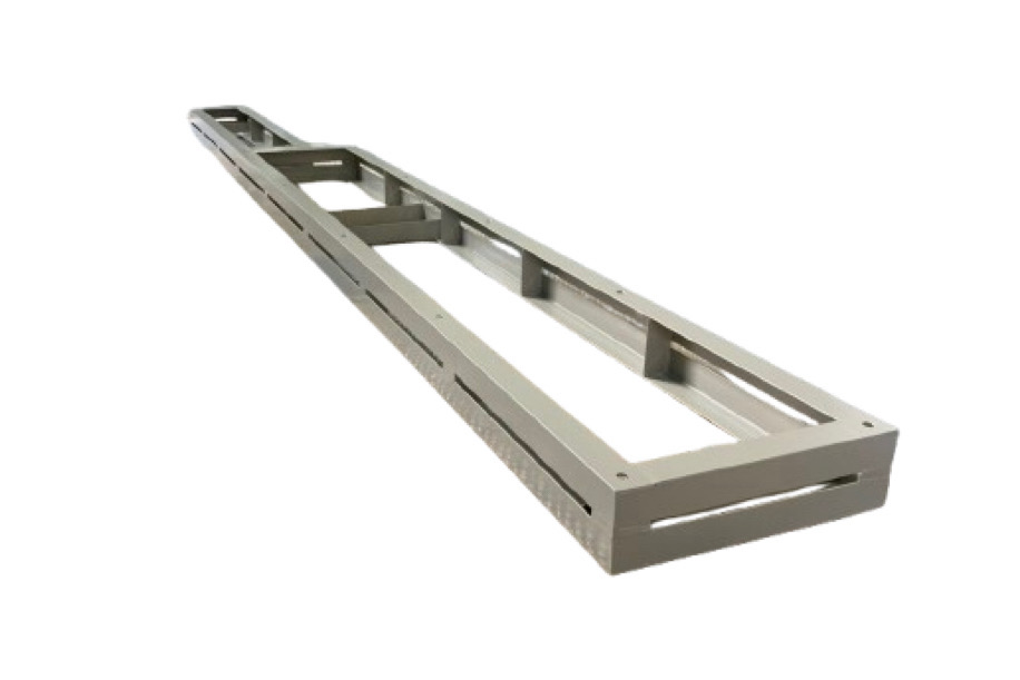 こちらは、板金溶接・製缶加工.COMが製作を行いました製品になります。お客様から頂いたポンチ絵をもとに図面を作成し製作致しました。幅が狭く床の基礎面が傾斜があるため、一体構造を希望されていました。高さも低い為アングルにて製作致しました。表面処理は焼付塗装5Y7/1半艶にて施しております。