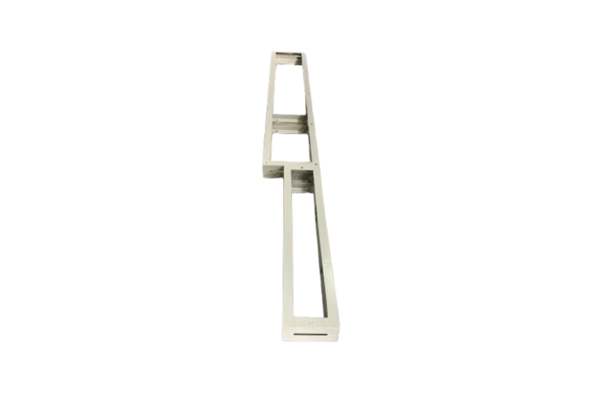 こちらは、板金溶接・製缶加工.COMが製作を行いました製品になります。お客様から頂いたポンチ絵をもとに図面を作成し製作致しました。幅が狭く床の基礎面が傾斜があるため、一体構造を希望されていました。高さも低い為アングルにて製作致しました。表面処理は焼付塗装5Y7/1半艶にて施しております。