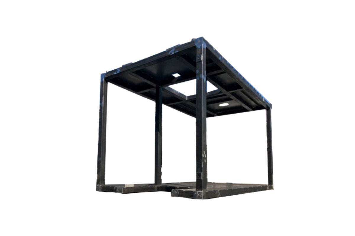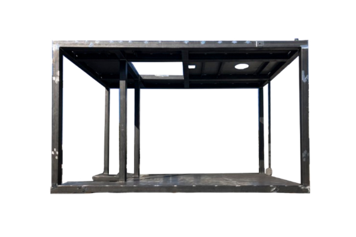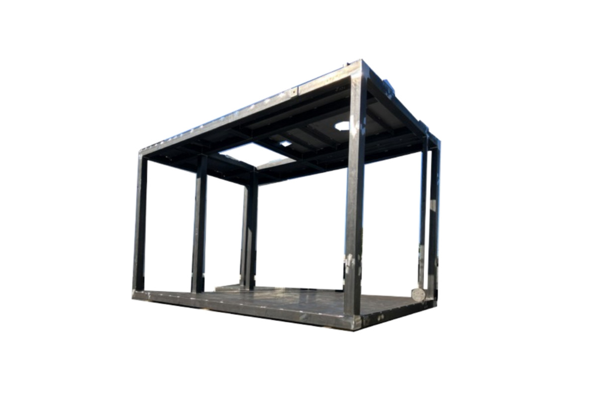 こちらは、板金溶接・製缶加工.COMにて製作いたしました製品でございます。お客様より頂いた図面を基に作成しました設備用架台で、床部には装置関係を配置し、中央部には天井より上部に突き出るほどの高さのある機材が配置されます。天井は通路として歩く為の縞鋼板を張り付けて有ります。架台が大きい為、溶接時に歪みが出ない様に確実に固定して変形を抑える事に注意して溶接しました。