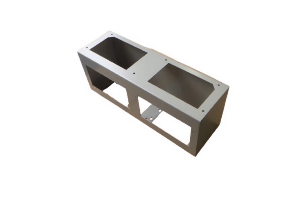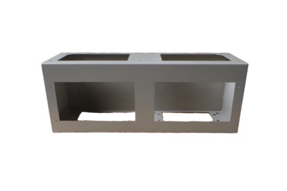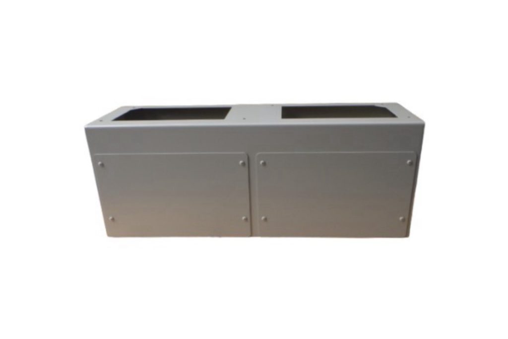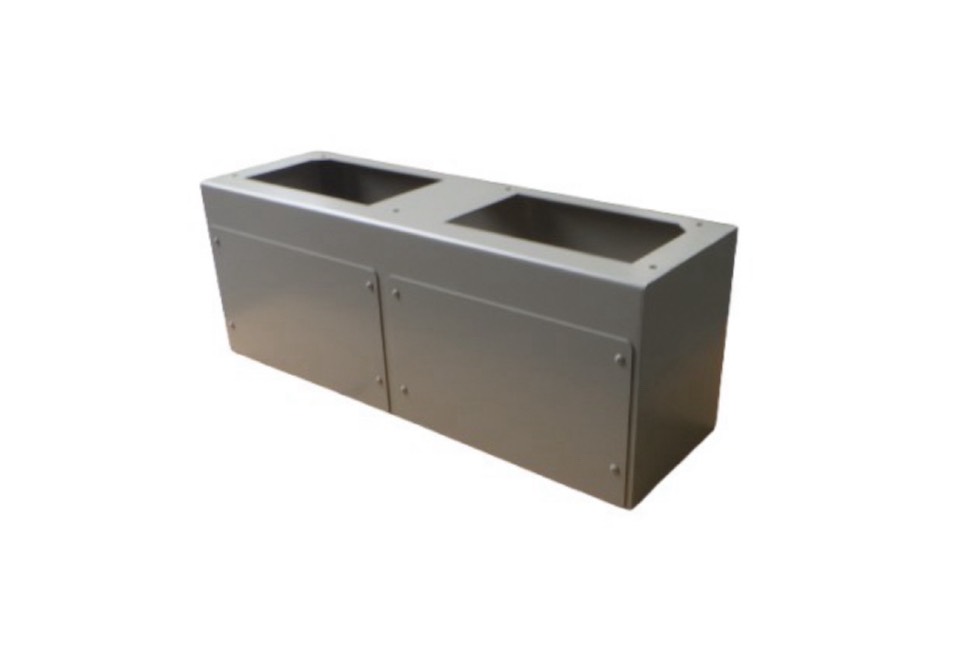 こちらの製品は、板金溶接・製缶加工.COMが製作を担当いたしました。お客様の簡単な図面を参考に図面を作成しまして、お客様に承認して頂き製作させて頂きました。盤下カバーにて正面を開口出来るよう蓋を取付 焼付塗装5/7/1半艶にて施しております。